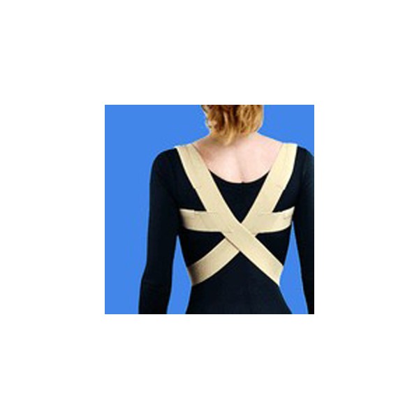 Espaldillera corrector de posiciones incorrectas, ortesis compuesta por dos cintas elásticas que forman un anillo en uno de sus extremos. Sistema de cierre regulable mediante Velcro.